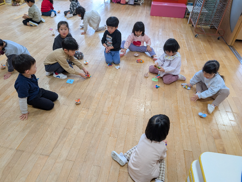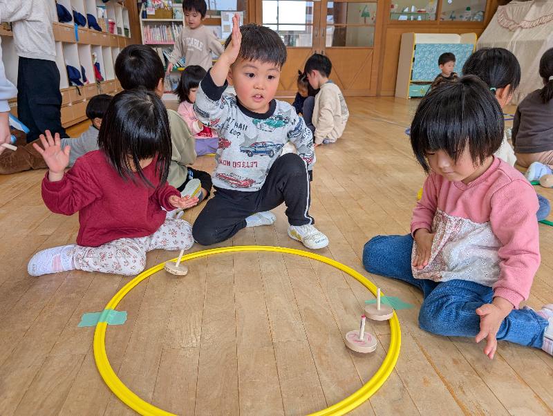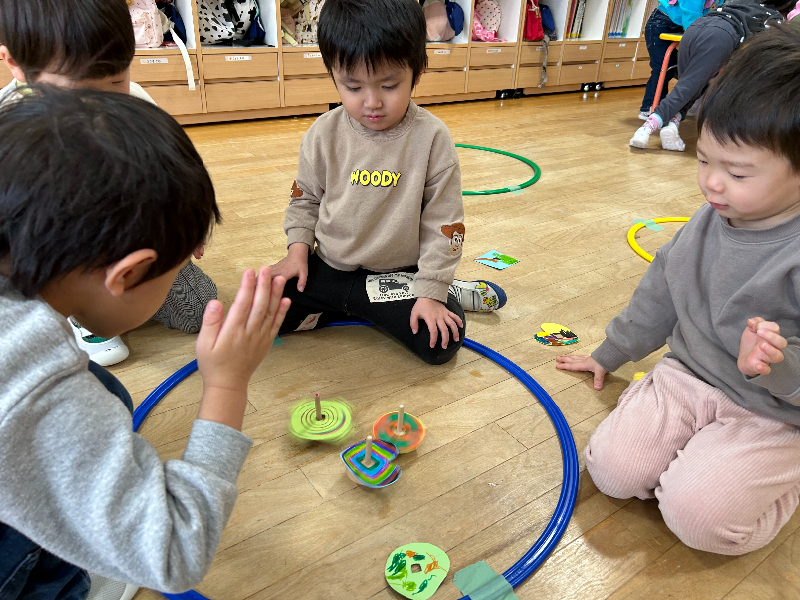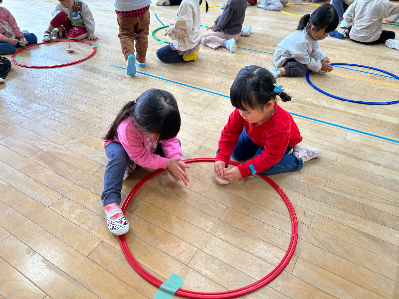 最初は「難しい…!」と言っていた子も、友だちの回し方をじっと見て真似したり、上手な子にコツを聞いたりするなど諦めずに挑戦し、できるようになってきました