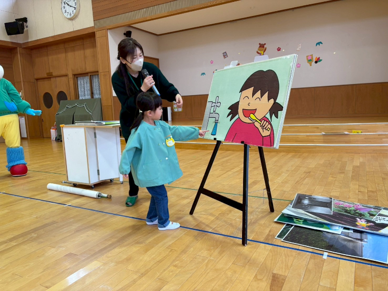 さて、どんなところに水の無駄遣いがあるかな…とクイズ。歯磨きするときは水を止めよう!シャワーで遊ぶのはやめよう!子どもたちはすぐにわかって手をあげて答えてくれましたよ