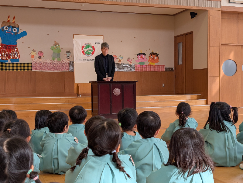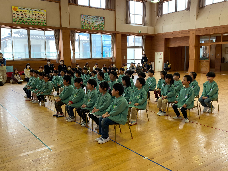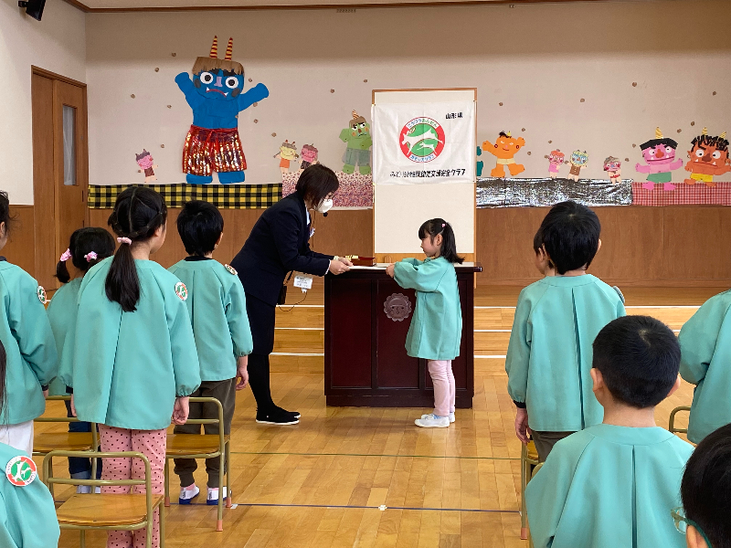 年長組さんは修了式も行われました。名前を呼ばれると元気に返事をして立ち、お辞儀をする姿はとても立派でした。指導員さんのお話や係の方のクイズを通してあらためて道路の歩き方や雨の日の注意、いかのおすしについて真剣に聞いていた子どもたちです。春から小学生のみなさん交通ルールを守って元気に登校してね
