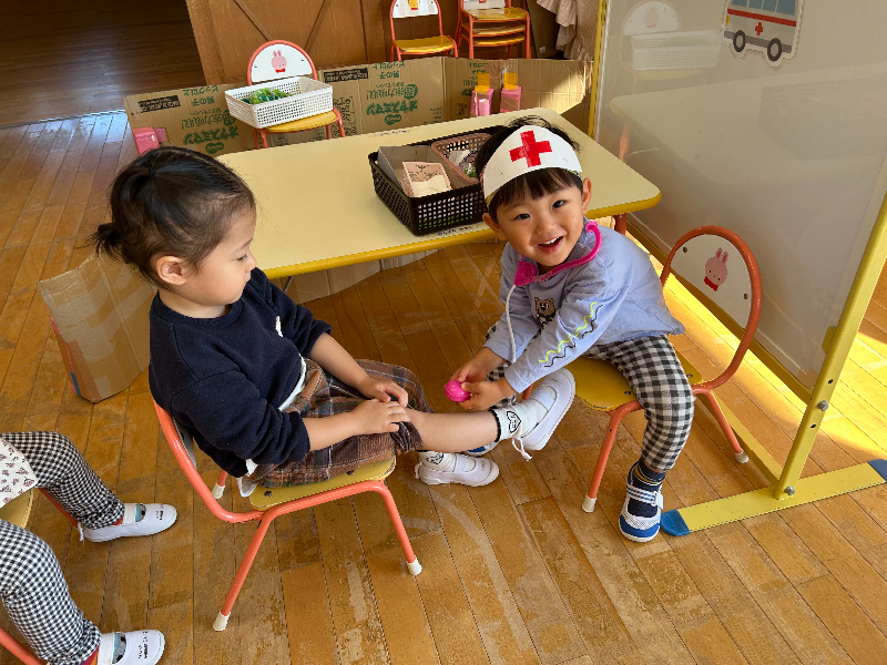 お医者さんや患者さんになりきって「おなかが痛いです。」「注射しようね。」などやり取りすることを楽しんでいます