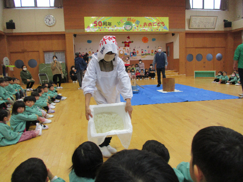 幼稚園の遊戯室で毎年恒例の"もちつき"を行いました。