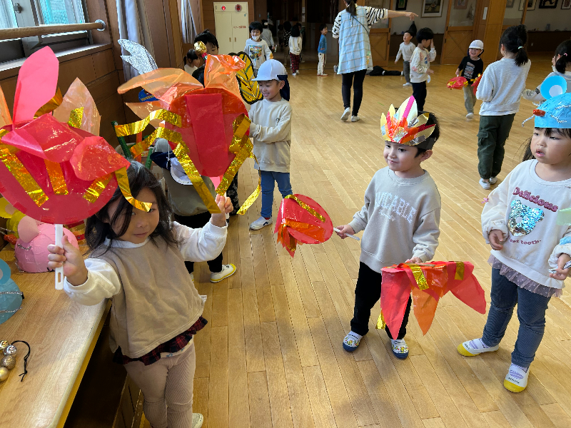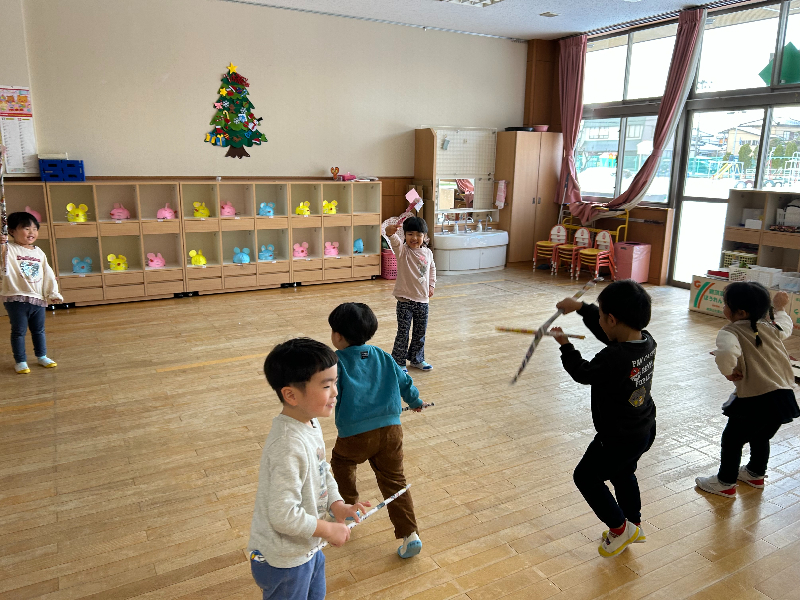 ゆうぎ会後も年長さんが使った小道具を貸してもらって、遊戯室でくり返し踊っていました![]()