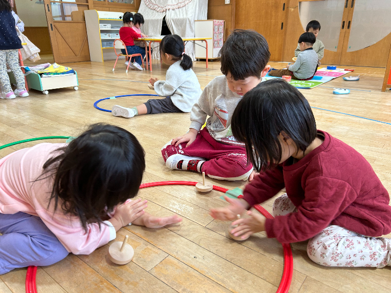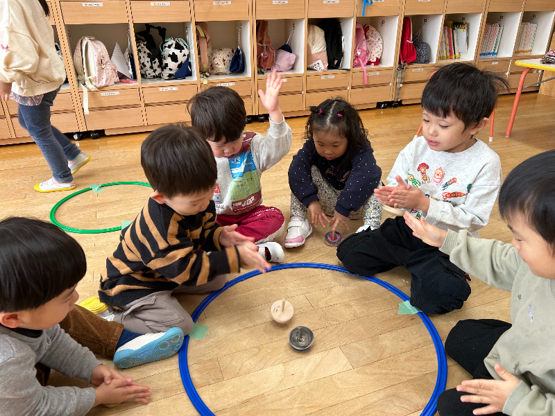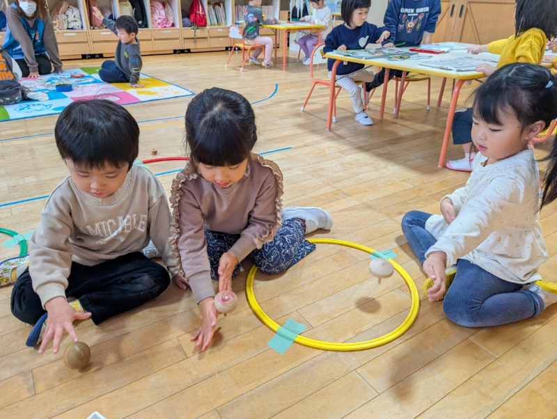 最初は「難しい…!」と言っていた子も、友だちの回し方をじっと見て真似したり、上手な子にコツを聞いたりするなど諦めずに挑戦し、できるようになってきました