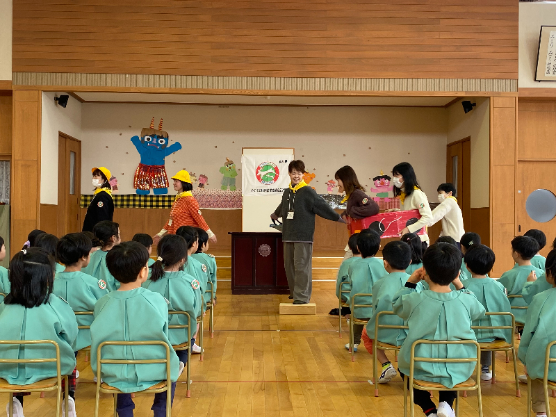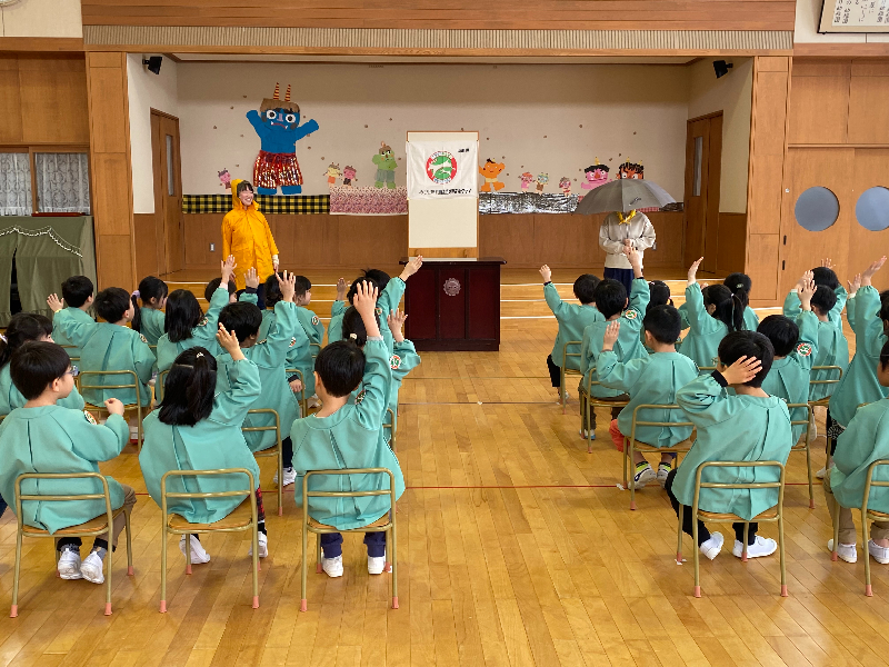 年長組さんは修了式も行われました。名前を呼ばれると元気に返事をして立ち、お辞儀をする姿はとても立派でした。指導員さんのお話や係の方のクイズを通してあらためて道路の歩き方や雨の日の注意、いかのおすしについて真剣に聞いていた子どもたちです。春から小学生のみなさん交通ルールを守って元気に登校してね