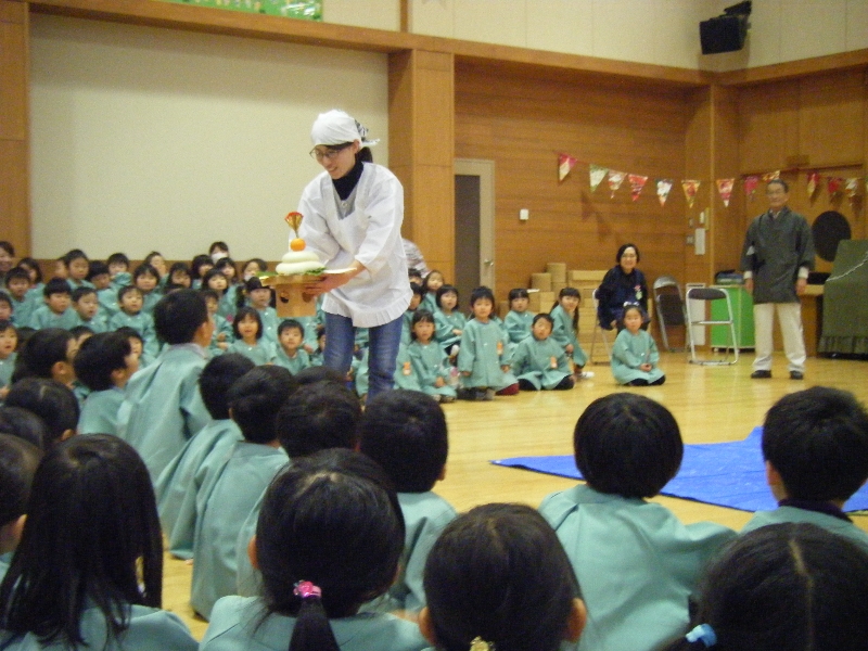 」と元気にかけ声をかけて興味津々に見ていました。おもちがつきあがった後は、鏡餅にして飾りました![]()